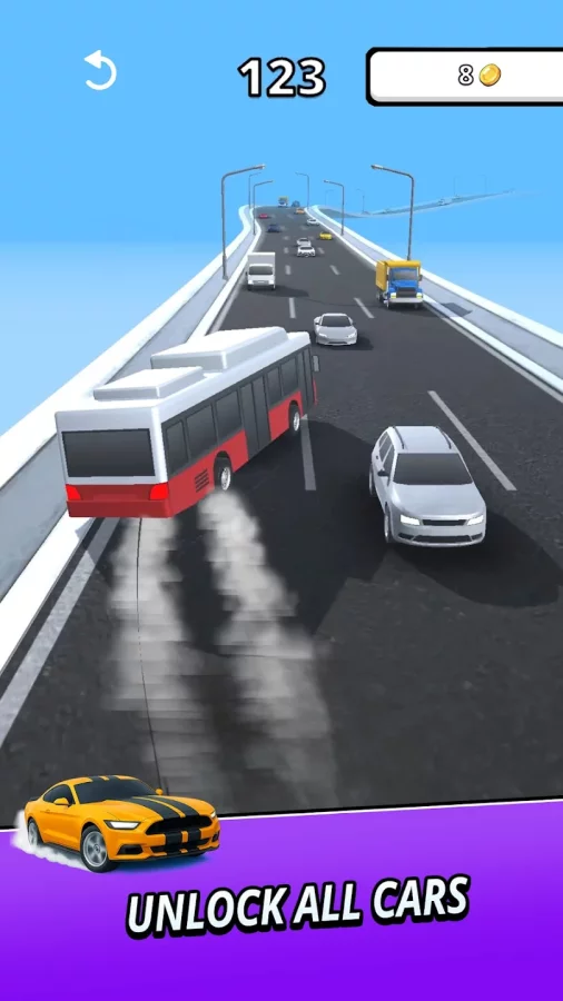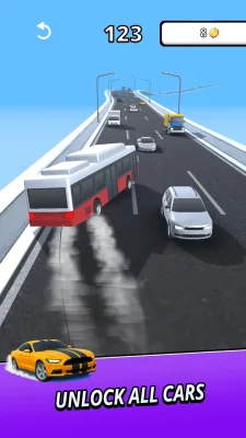 The gameplay is simple. The car accelerates automatically. It is necessary to react in time to the traffic flows and change the direction. An error leads to a collision, and the attempt ends. There are different cars that open up as you play.